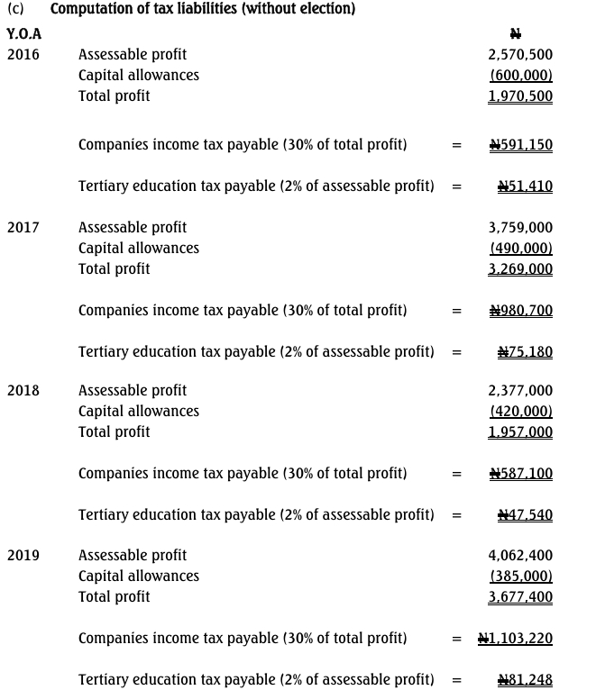 Compute the tax liabilities of the company for the relevant years of assessment, taking into consideration the options available to the company.