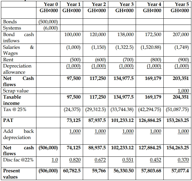 A special investment in systems and software, computers and other fixed assets is GH¢6 million in year zero and tax deductible depreciation is on a straight-line basis with a scrap value of GH¢1 million. Salaries and wages and other administrative expenses will be GH¢1 million in year 1 and grow at 15% per annum on the previous year’s figure. Rent is also determined at GH¢0.5 million in year 1 and growing by GH¢100,000 each year.